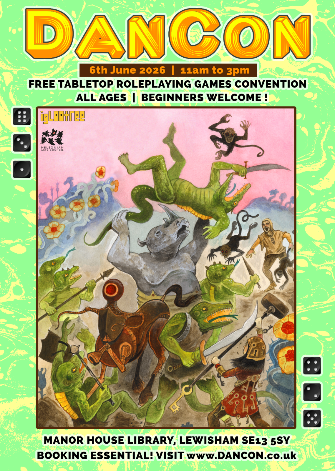 In partnership with The Melsonian Arts Council and Iglootree Books, we have a bevy of illustrators and game designers running games alongside our crew of experienced volunteer gamesmasters.